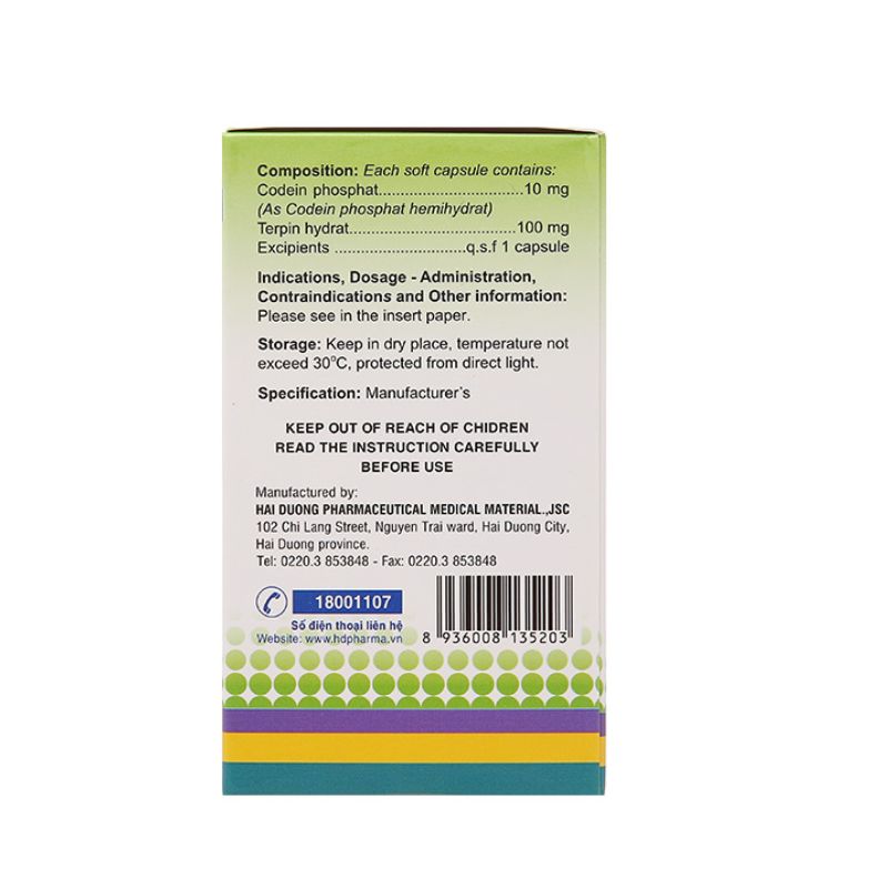 - Hoạt chất: Codein phosphat (Dưới dạng Codein phosphat hemihydrat) 10 mg, Terpin hydrat 100 mg.